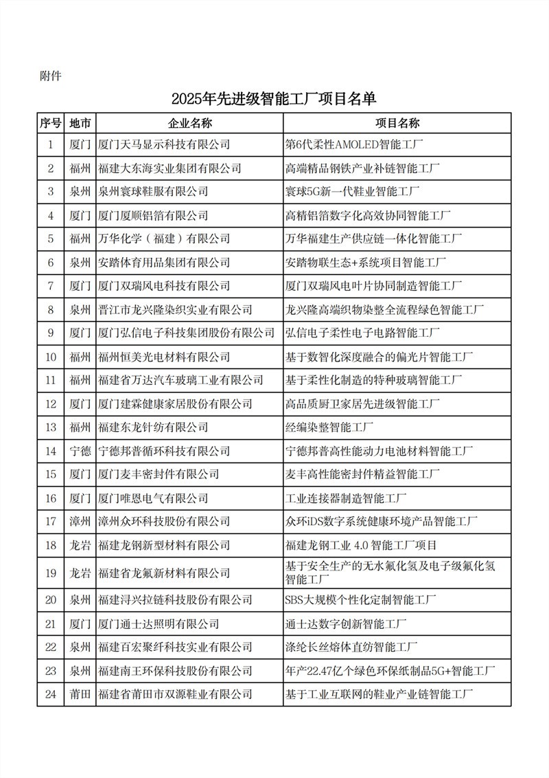 为深入推进智能制造发展,经研究,确定厦门天马显示科技有限公司第6代柔性AMOLED智能工厂等67个项目为2025年先进级智能工厂项目(具体名单见附件),现予以公布。