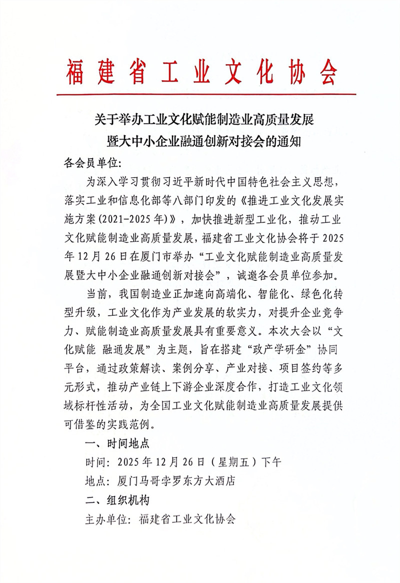 关于举办工业文化赋能制造业高质量发展 暨大中小企业融通创新对接会的通知
