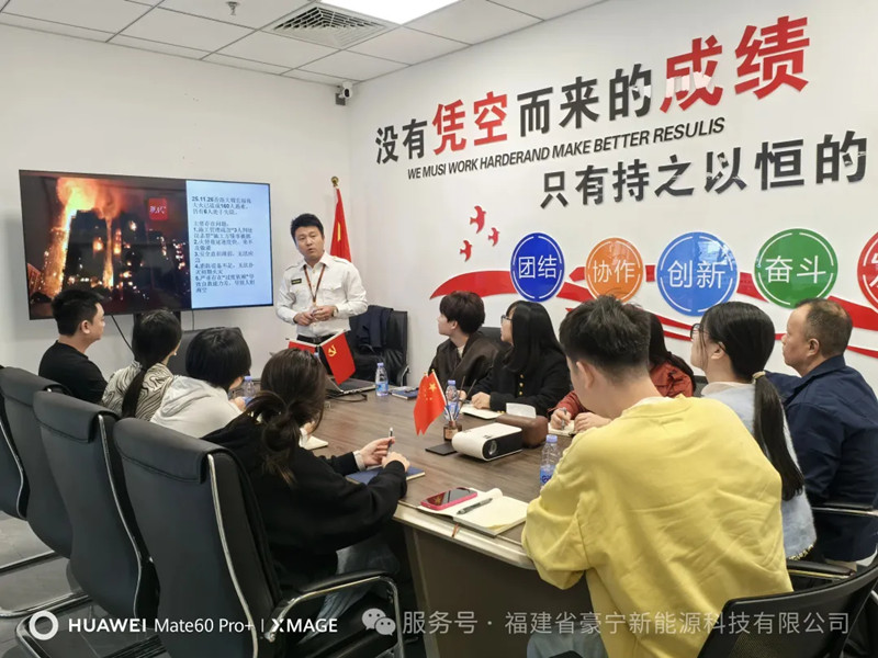 消防安全无小事,防患未然记心间。为进一步强化全体员工消防安全意识,提升火灾应急处置、自救互救能力,切实保障员工生命财产安全与公司办公秩序稳定,近日,豪宁新能源组织全体员工开展消防安全专题学习会,以理论讲解+实操演练相结合的方式,筑牢职场安全“防火墙”。